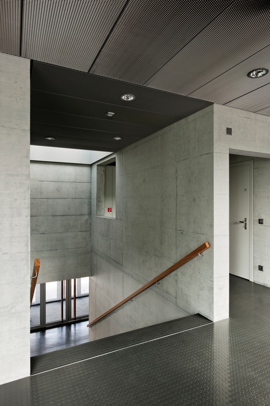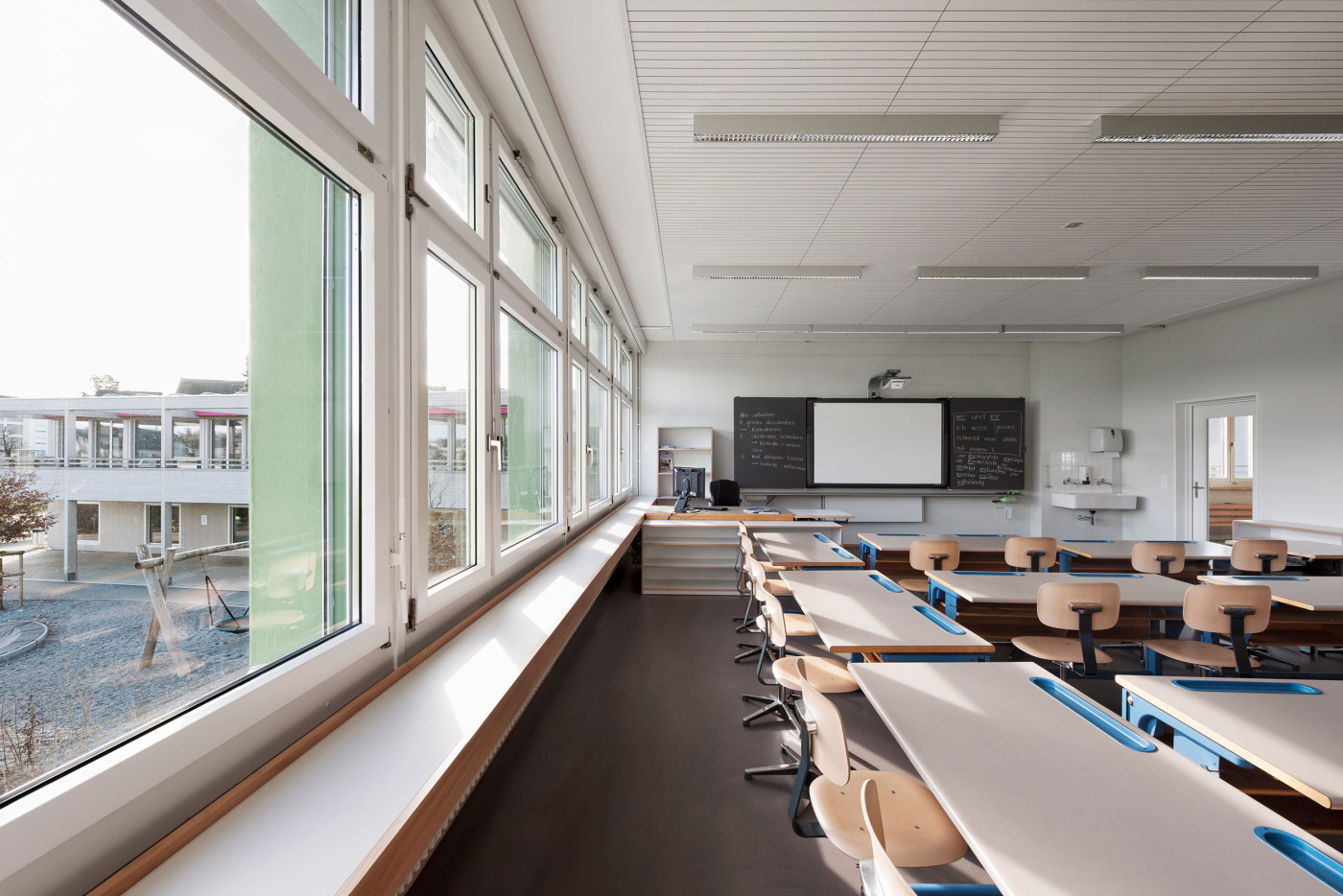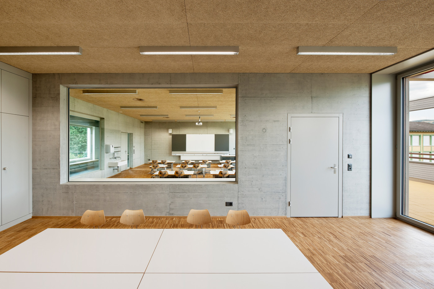 Sowohl im Neubau wie auch in den Bestandsbauten schaffen Verbindungstüren und Sichtbezüge unter den einzelnen Räumen die nötige Transparenz und Flexibilität für einen zeitgemässen Schulunterricht. Rohe Materialien und eine neutrale Farbgebung vermitteln dabei das angestrebte Bild einer Lern-Werkstatt und lassen ein Maximum an individuellem Gestaltungsraum zu.