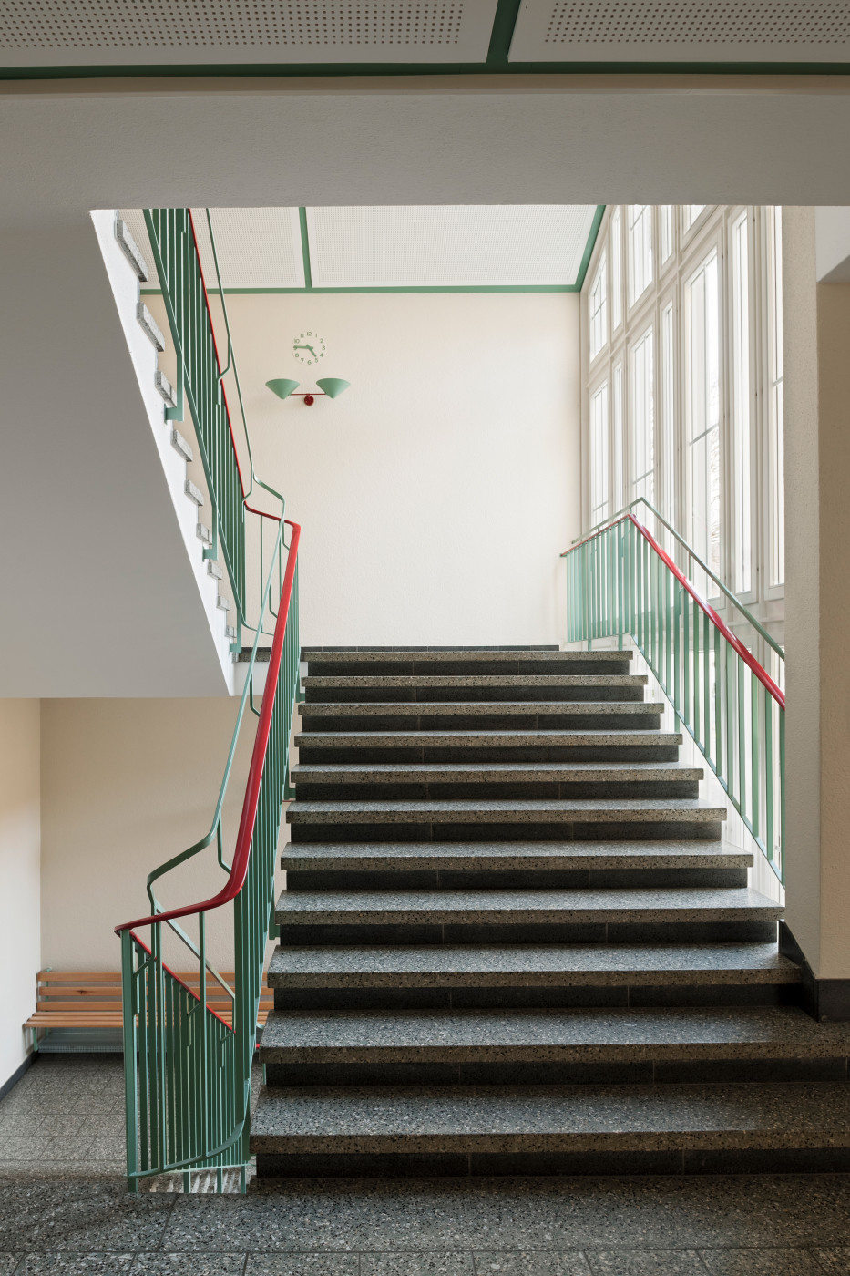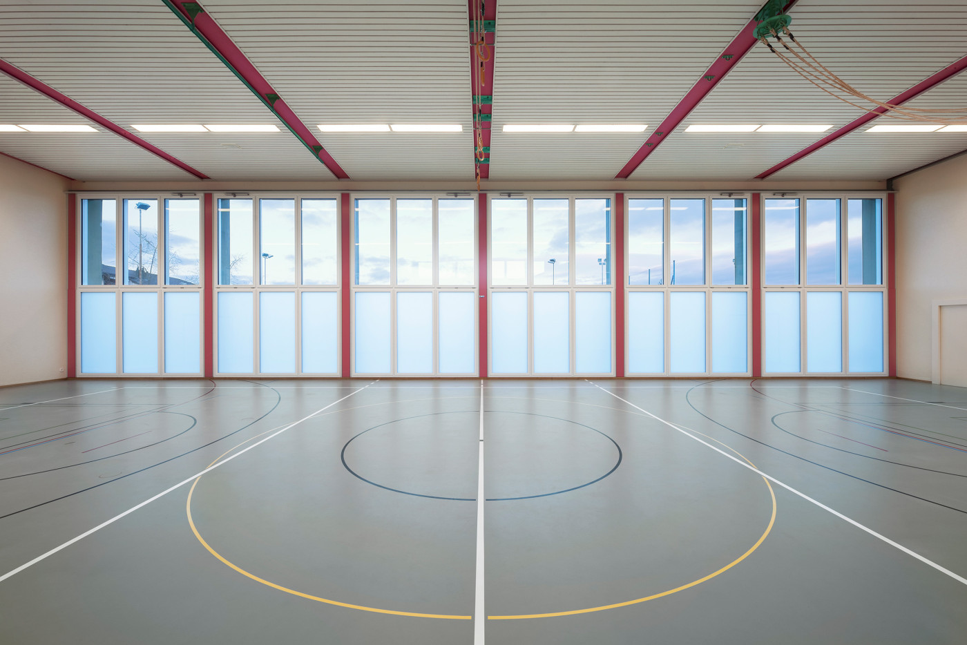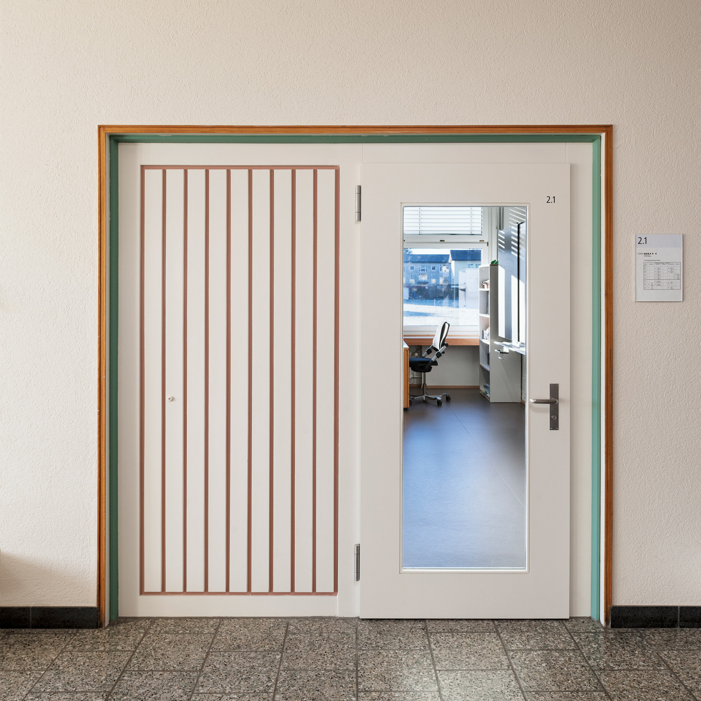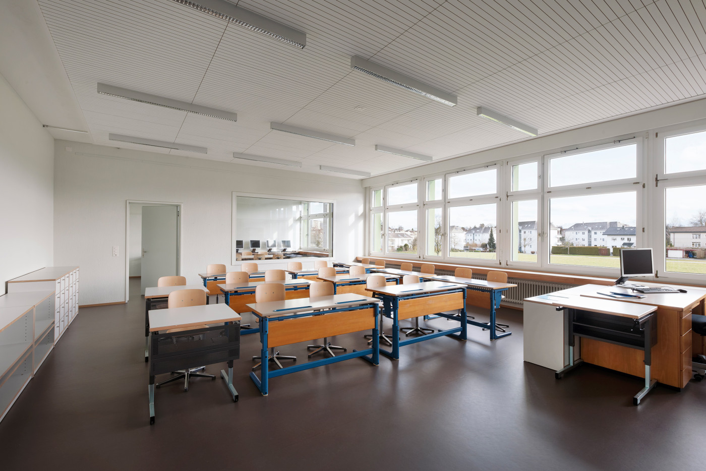 Sowohl im Neubau wie auch in den Bestandsbauten schaffen Verbindungstüren und Sichtbezüge unter den einzelnen Räumen die nötige Transparenz und Flexibilität für einen zeitgemässen Schulunterricht. Rohe Materialien und eine neutrale Farbgebung vermitteln dabei das angestrebte Bild einer Lern-Werkstatt und lassen ein Maximum an individuellem Gestaltungsraum zu.