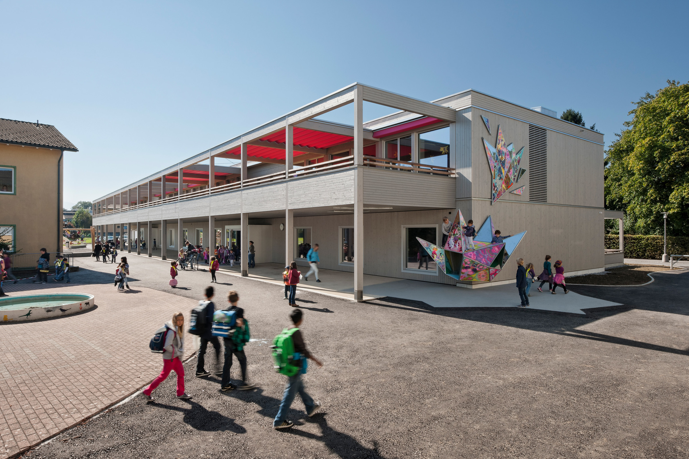 Das in Hybridbauweise konstruierte Gebäude ist linear in Schichten aufgebaut: Der als Garderobe dienende Korridor, vier Klassenzimmer mit je einem Gruppen- und Materialraum und der mit Pergolen und Markisen beschattete Unterricht im Freien. Zwei Treppen verbinden die beiden Geschosse. Deren gespiegelte Disposition mit dem aufgeständerten Balkon ermöglicht es, den darunter entstehenden Raum als Pausenhalle zu nutzen.