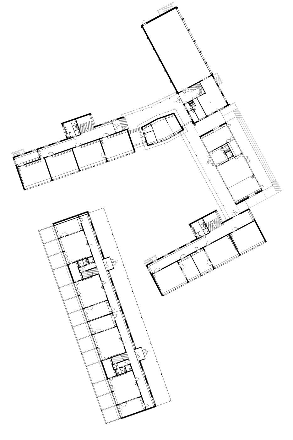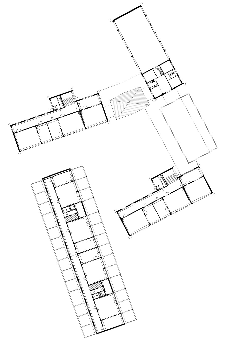 Der in der ersten Etappe realisierte Neubau „Trakt Drei“ beherbergt die Basisstufe. Zweigeschossig, parallel zur Bifangstrasse positioniert, bildet er zusammen mit den Bestandsbauten ein Ensemble, welches den Pausenplatz räumlich fasst und die Schulanlage gegen die Strasse hin abschliesst.