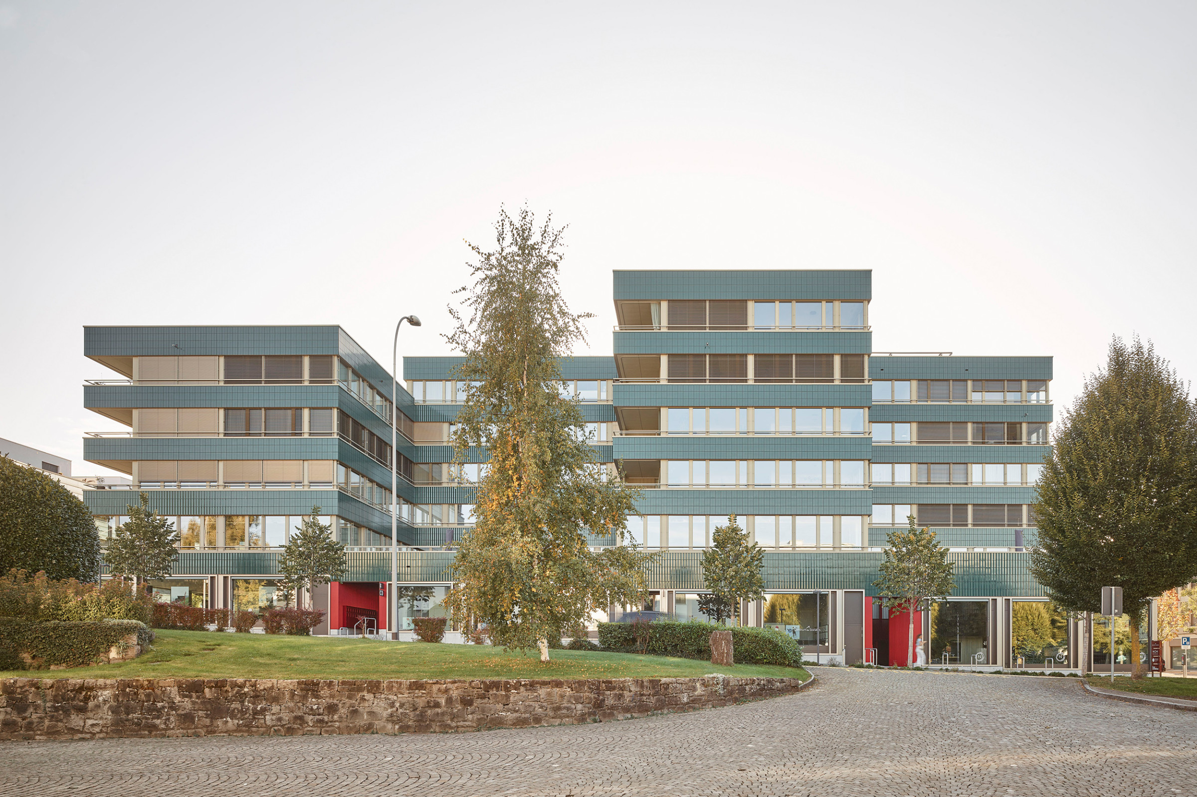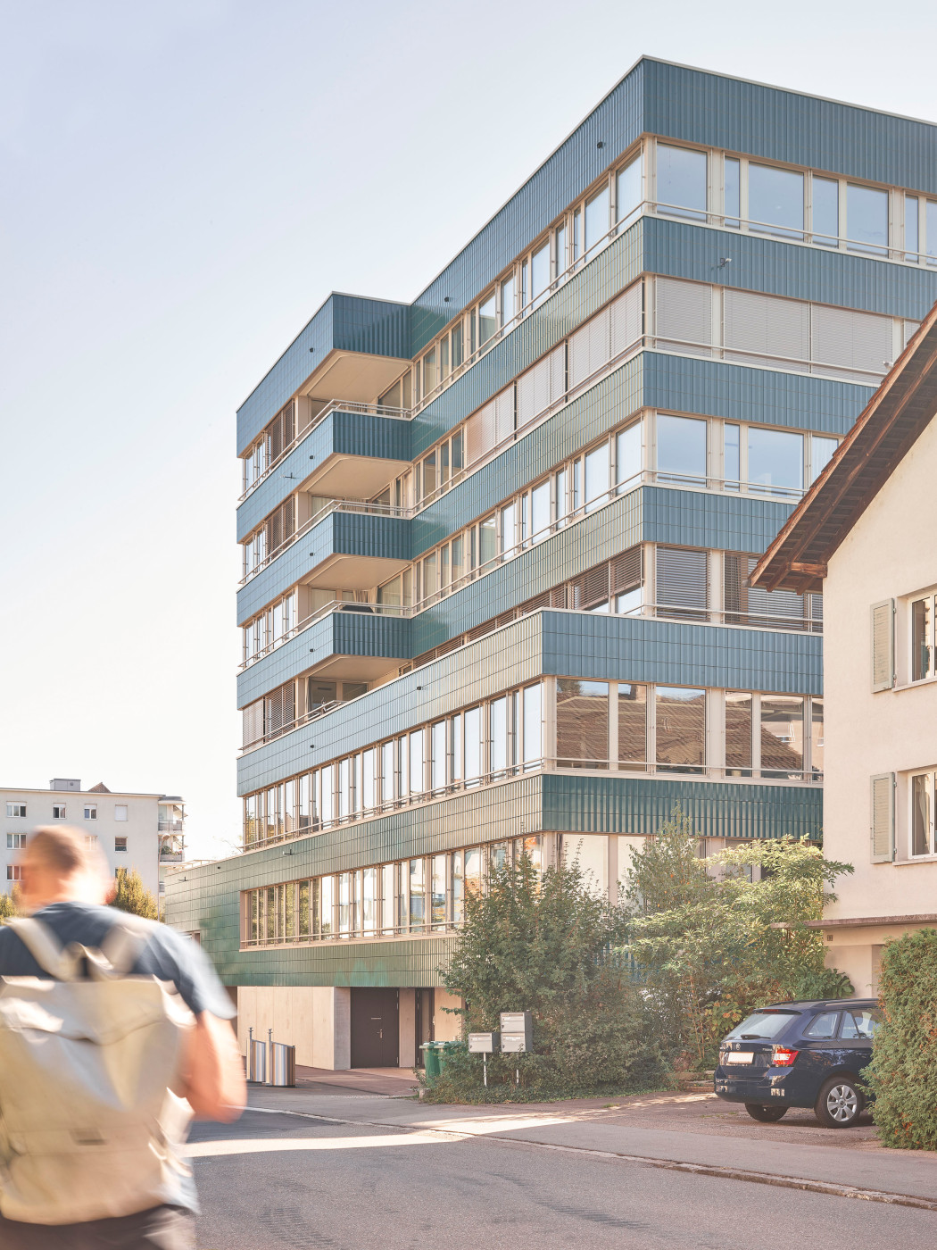 Glanz, Relief und Farbe der massgeschneiderten Keramikfassade tragen dazu bei, dass sich mit den im Verlauf des Tages ändernden Lichtverhältnissen auch das Aussehen des Gebäudes wandelt. Aussenvorhänge auf den Loggien und Ausstellmarkisen im Erdgeschoss tun das Ihrige dazu.