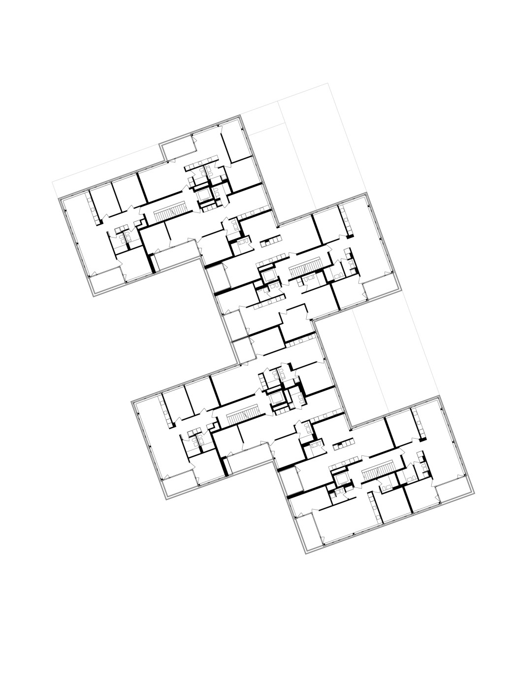 Jedes der oberen Geschosse zählt zwölf Wohnungen. Die kleineren, zentral liegenden Wohnungen sind in der Diagonale von Ost nach West organisiert und grenzen jeweils an zwei Höfe. An den Enden der einzelnen Gebäudearme liegen die grossen, auf drei Seiten orientierten Wohnungen. Bandfenster, offene Raumabfolgen und raumhohe Türen verleihen den Wohnungen Loft-ähnlichen Charakter. Sämtliche Loggien sind nach Süden oder Westen orientiert.