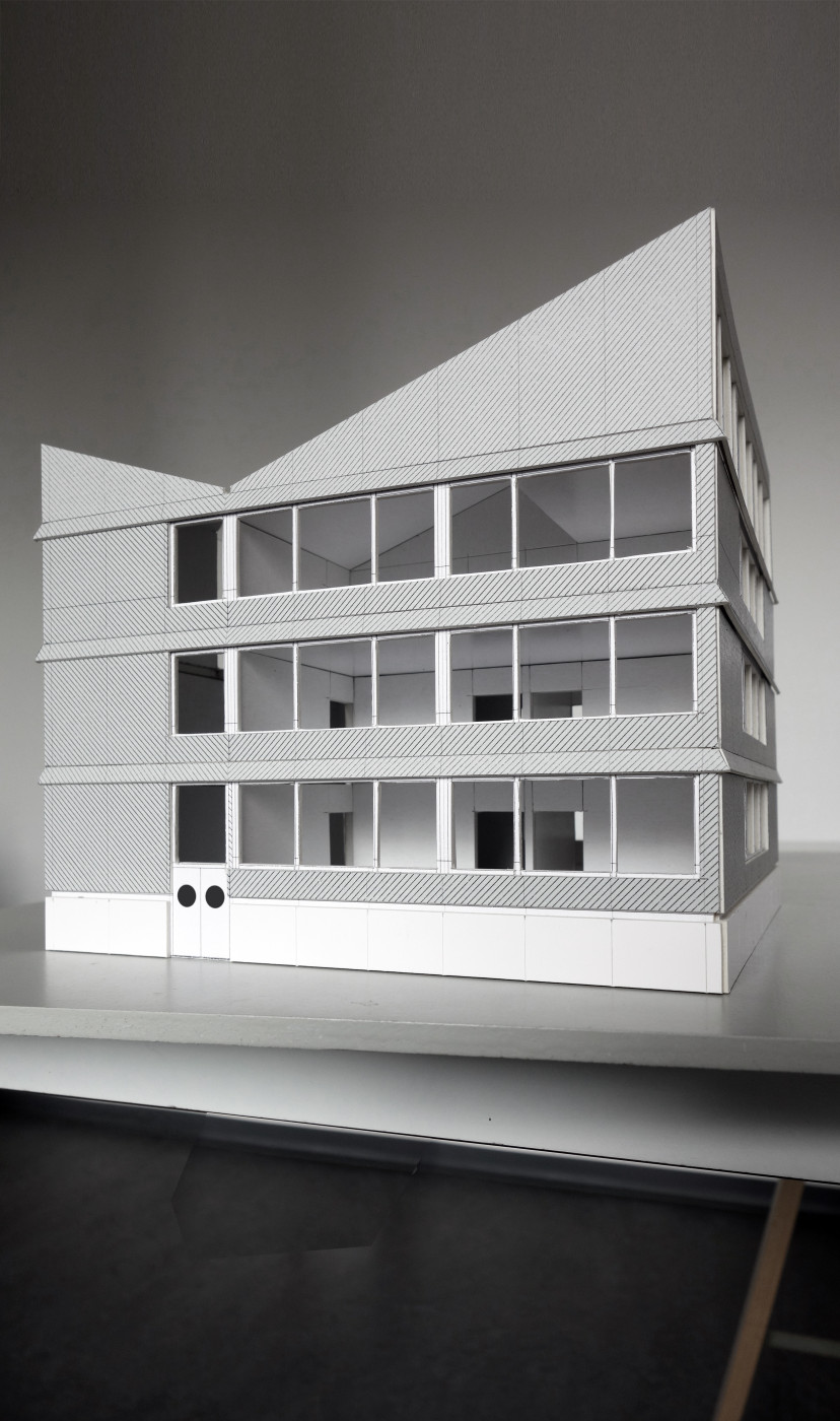 KIDS ON ROOF – Der Neubau der Unterstufe nimmt den Platz des alten Schulhauses ein. Er bildet den neuen Kopf der Schulanlage und ist mit seiner hohen, auf die Schulstrasse ausgerichteten Fassade bereits von der Hauptstrasse aus sichtbar. Die expressive Dachform, analog zum Turm des Vorgängerbaus, verleiht dem Neubau und der Institution Schule so das nötige Gewicht im Siedlungsgefüge.