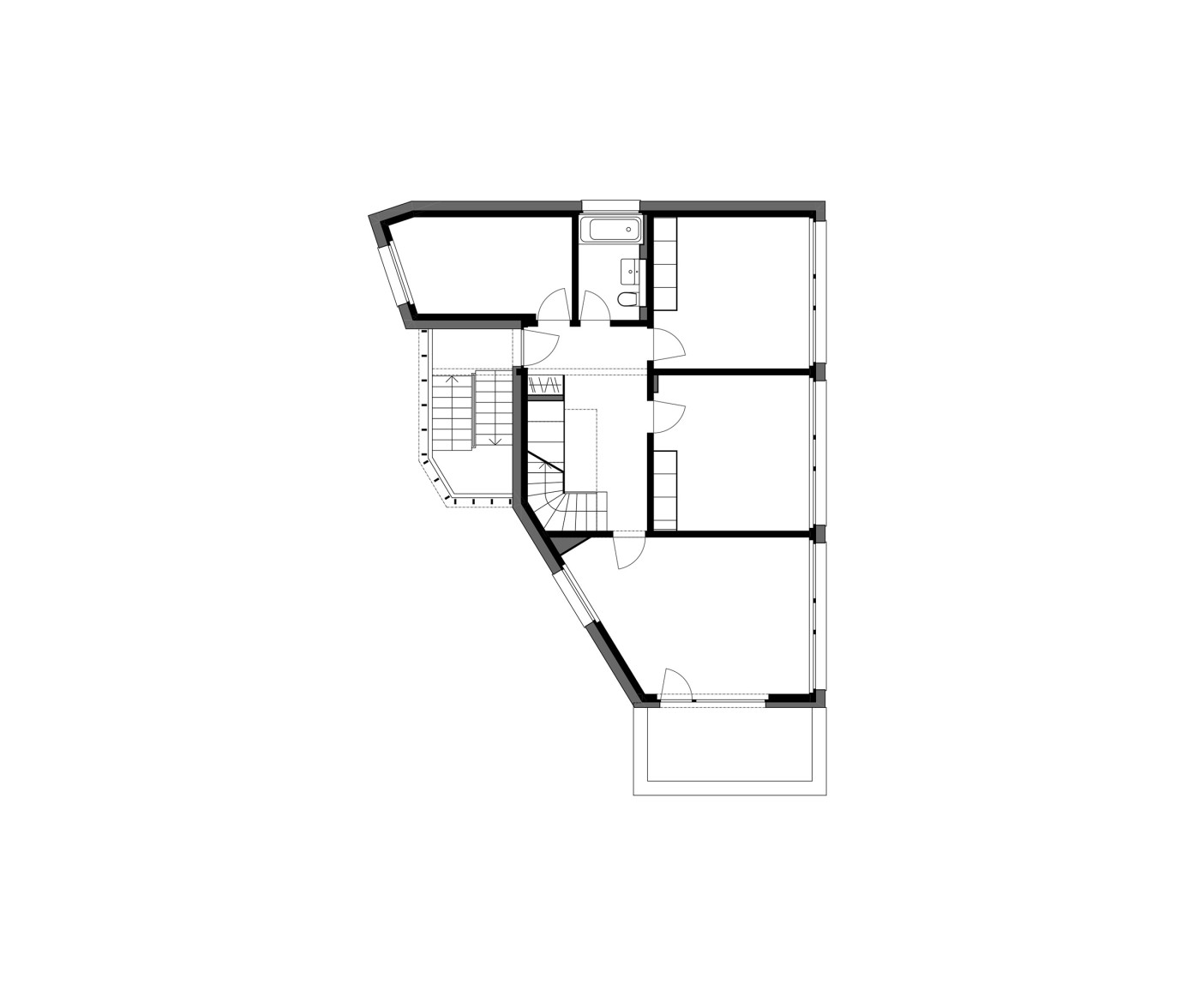 Der in mehreren Etappen erfolgte Umbau umfasst in groben Zügen die Aufstockung um je ein Voll- und ein Dachgeschoss, die Sanierung der Gebäudehülle, der kompletten Haustechnik und der bestehenden Wohnungen, die Erdbebenertüchtigung des Tragwerks und die Erstellung zusätzlich benötiger Nebenräume im Untergeschoss. All dies, ohne dass dabei Gliederung und Ausdruck des keilförmigen Gebäudes verloren gehen.