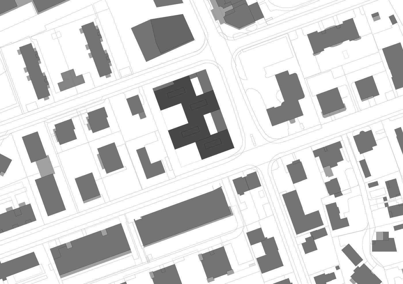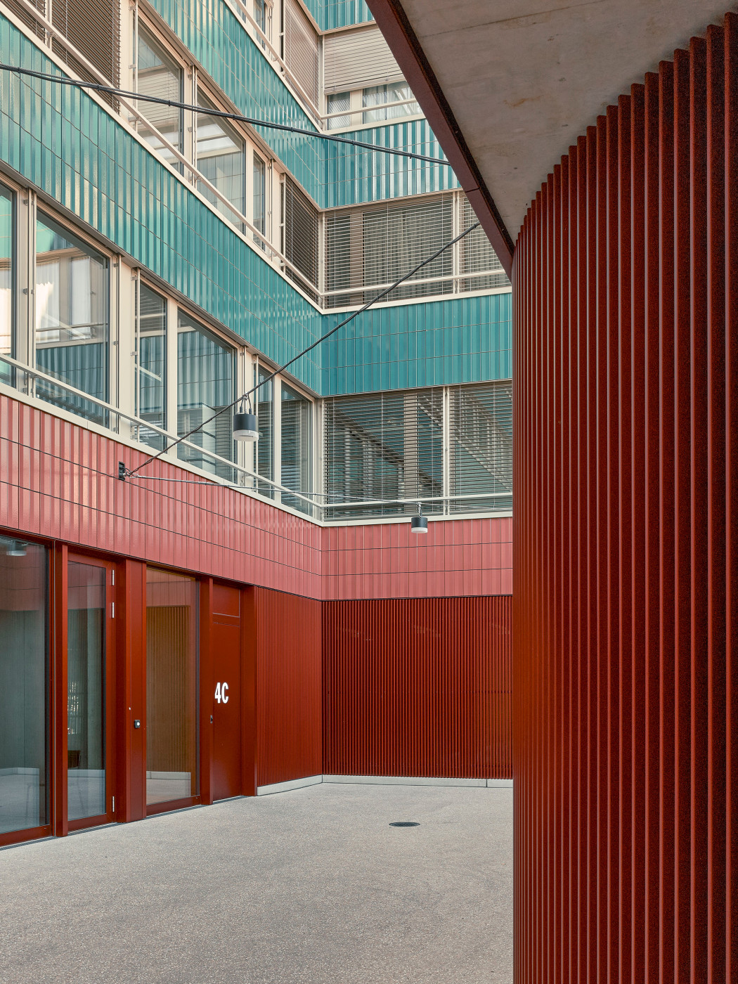 Durch das Vor- und Rückspringen der Gebäudeteile entstehen zwei- und dreiseitig gefasste Höfe, die sich auf der Westseite mit dem angrenzenden Grünstreifen verzahnen. Auf der Ostseite sind diese mit eingeschossigen Einbauten geschlossen. Somit entsteht entlang der Christoph-Schnyder-Strasse eine durchlaufende Schaufensterfront.
