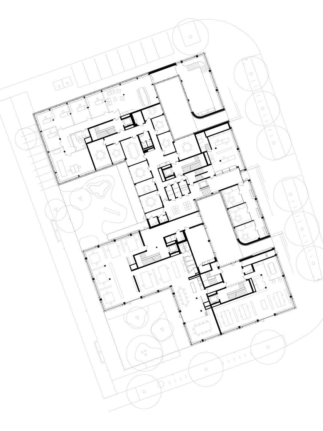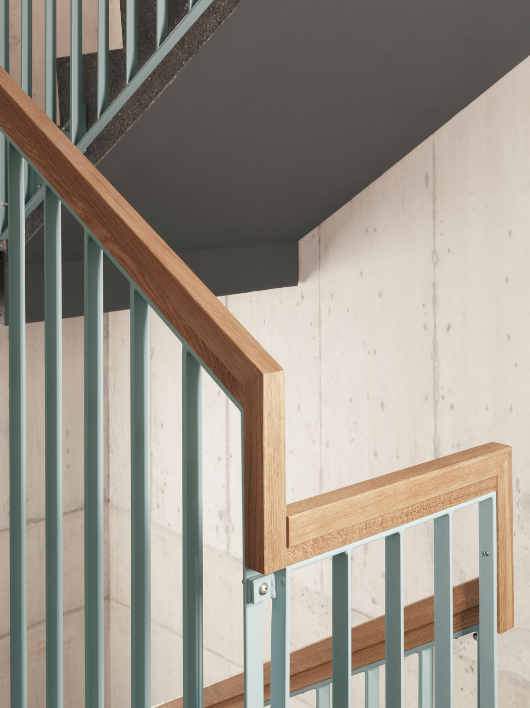 Das Erdgeschoss beherbergt Verkaufs- und Dienstleistungsflächen. Das erste Obergeschoss wird als eine grosse zusammenhängende Bürofläche genutzt. In den vier Geschossen darüber sind 45 Wohnungen untergebracht. Alle Häuser werden über die beiden strassenseitigen Höfe erschlossen, an welche neben den Eingangshallen auch je ein Gemeinschaftsraum angrenzt. Die Treppenhäuser führen alle aufs Dach. Dieses ist mit begehbaren und unterschiedlich begrünten Flächen sowie mit Pergolen und einer Aussenküche zu einem attraktiven, für alle Bewohner zugänglichen, Dachgarten ausgestaltet.