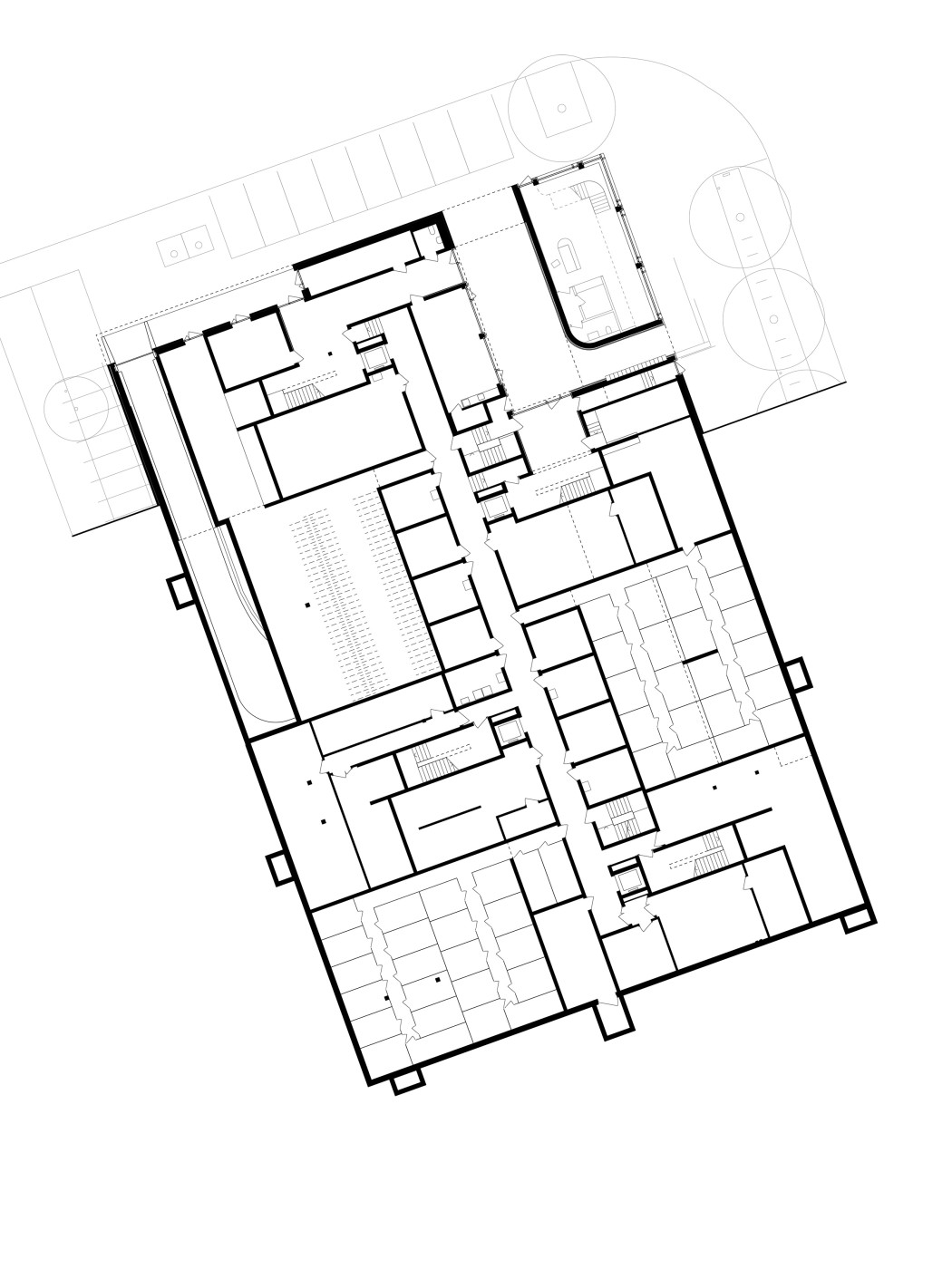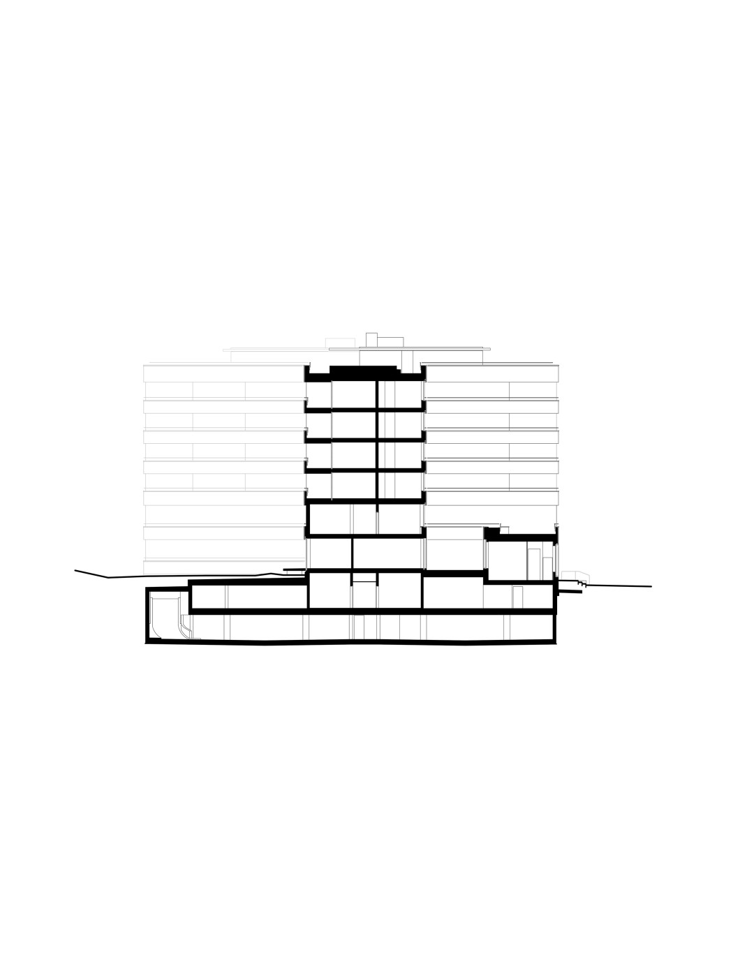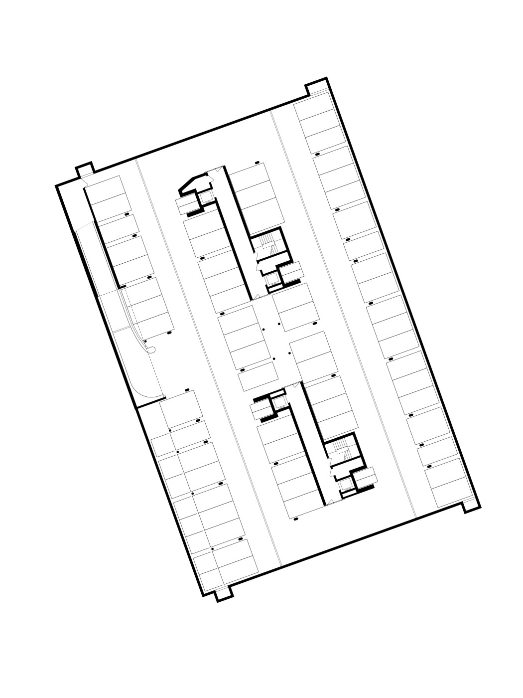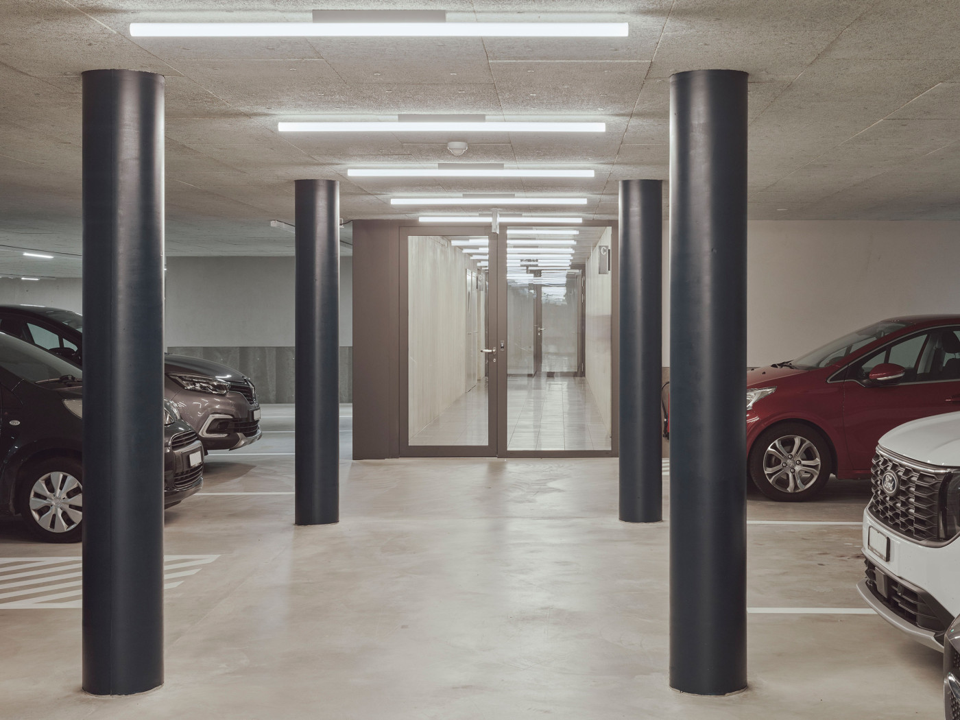 Im Untergeschoss liegt das Parking mit 60 Abstellplätzen. Das darüberliegende Zwischengeschoss beherbergt alle Technik- und Kellerräume sowie ein grosszügiges Veloparking. Ein langer, zur «Rue intérieure» ausgebauter, Korridor verbindet die vier Treppenhäuser der Obergeschosse mit den zwei Treppen des Parkings.