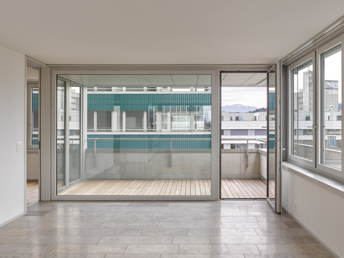 Jedes der oberen Geschosse zählt zwölf Wohnungen. Die kleineren, zentral liegenden Wohnungen sind in der Diagonale von Ost nach West organisiert und grenzen jeweils an zwei Höfe. An den Enden der einzelnen Gebäudearme liegen die grossen, auf drei Seiten orientierten Wohnungen. Bandfenster, offene Raumabfolgen und raumhohe Türen verleihen den Wohnungen Loft-ähnlichen Charakter. Sämtliche Loggien sind nach Süden oder Westen orientiert.