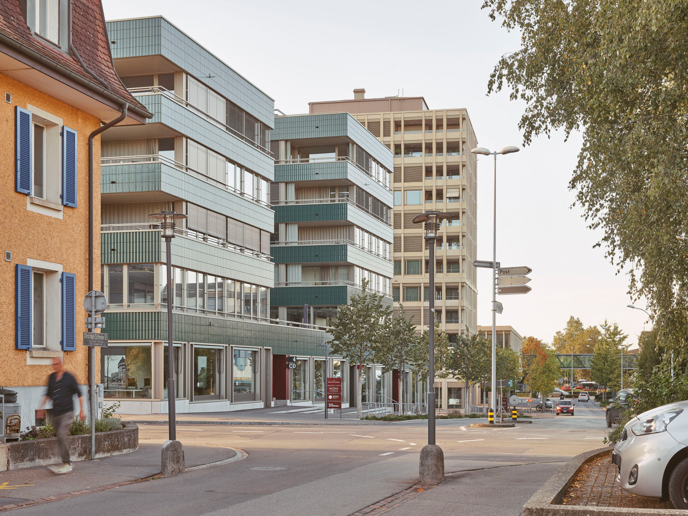 Das neue Wohn- und Geschäftshaus ist in Höhe und Tiefe gestaffelt und erscheint – je nach Blickwinkel – als ein grosses oder als vier miteinander verbundene Häuser. Die markante Gliederung des Volumens fügt dieses passend in das gebaute Umfeld ein.