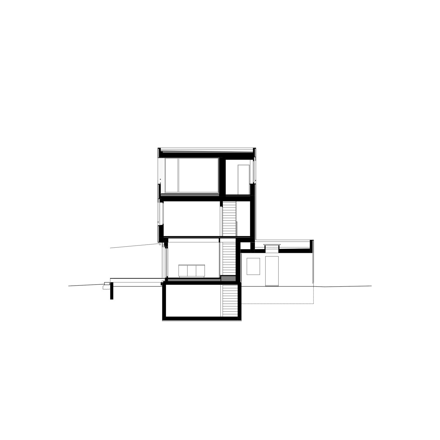 Im Obergeschoss sind drei beinahe quadratische Zimmer entlang der linearen Erschliessung aufgereiht. An deren Ende befinden sich das Bad und ein Arbeitsbereich. Im Dachgeschoss lässt sich das Elternschlafzimmer, oder ein zweites Wohnzimmer, mit einer Schiebetüre vom restlichen Geschehen abtrennen. Nach dem Aufstieg winkt die Aussicht als Belohnung.