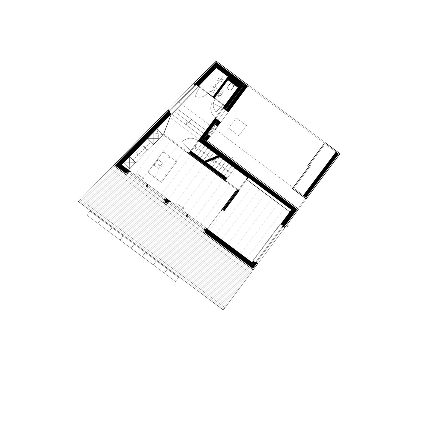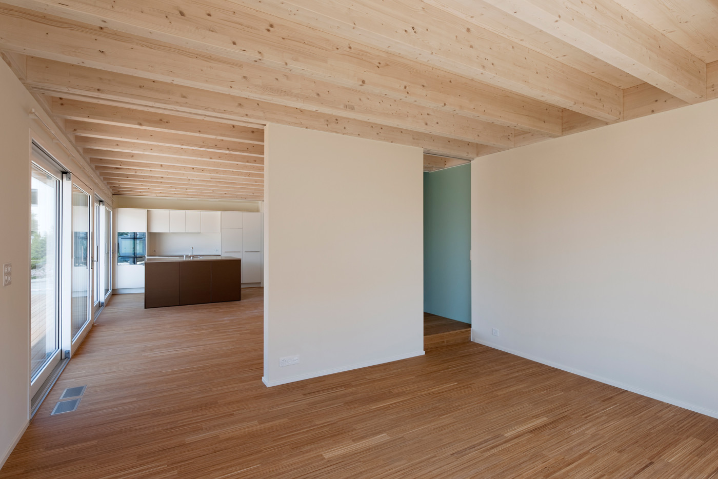 Der Neubau besetzt die nordöstliche Ecke des Grundstücks. Das Erdgeschoss ist dabei nach Südwesten orientiert. Durch das Ineinanderschieben von Parkierung und Eingangsbereich entsteht die maximale Distanz zu den Nachbarn. Die grosszügige Veranda mit ausgefahrener Markise verdoppelt bei Schönwetter den Wohnraum. Die sichtbare Holzbalkendecke und die leicht getönten Wände sorgen für ein äusserst wohnliches Ambiente.