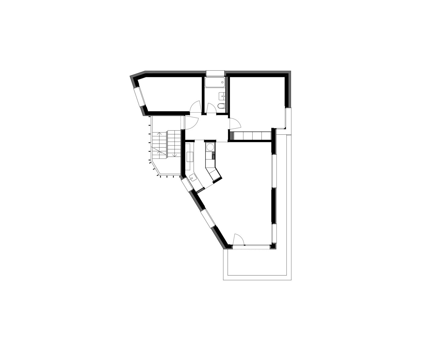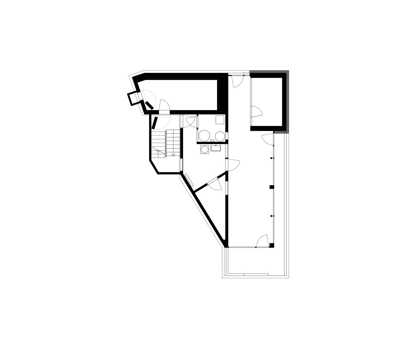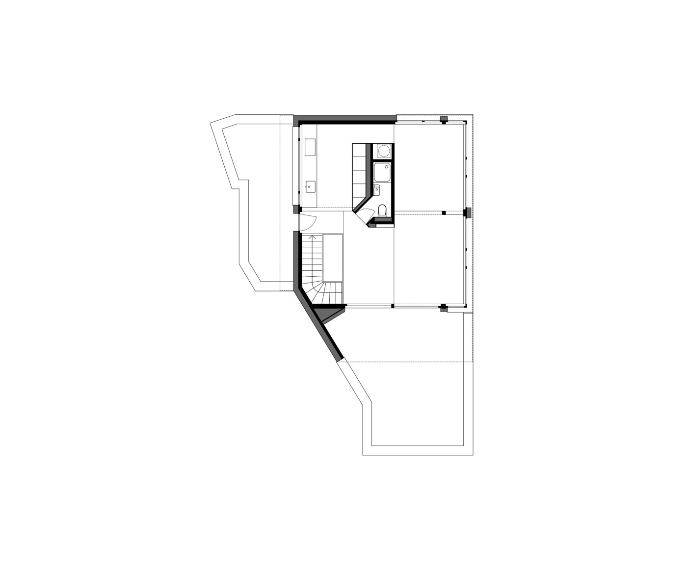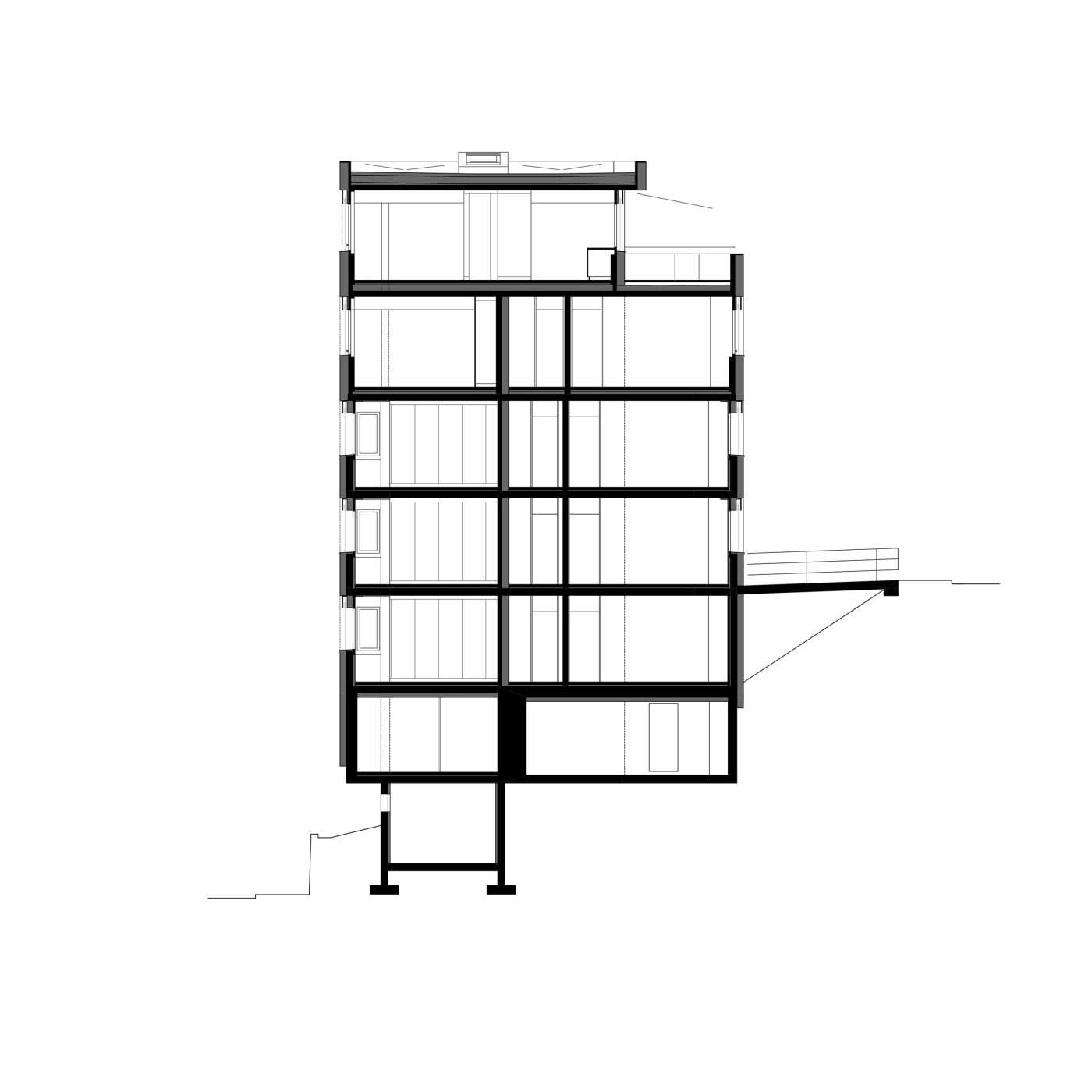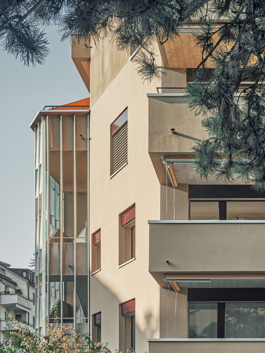 Der in mehreren Etappen erfolgte Umbau umfasst in groben Zügen die Aufstockung um je ein Voll- und ein Dachgeschoss, die Sanierung der Gebäudehülle, der kompletten Haustechnik und der bestehenden Wohnungen, die Erdbebenertüchtigung des Tragwerks und die Erstellung zusätzlich benötiger Nebenräume im Untergeschoss. All dies, ohne dass dabei Gliederung und Ausdruck des keilförmigen Gebäudes verloren gehen.