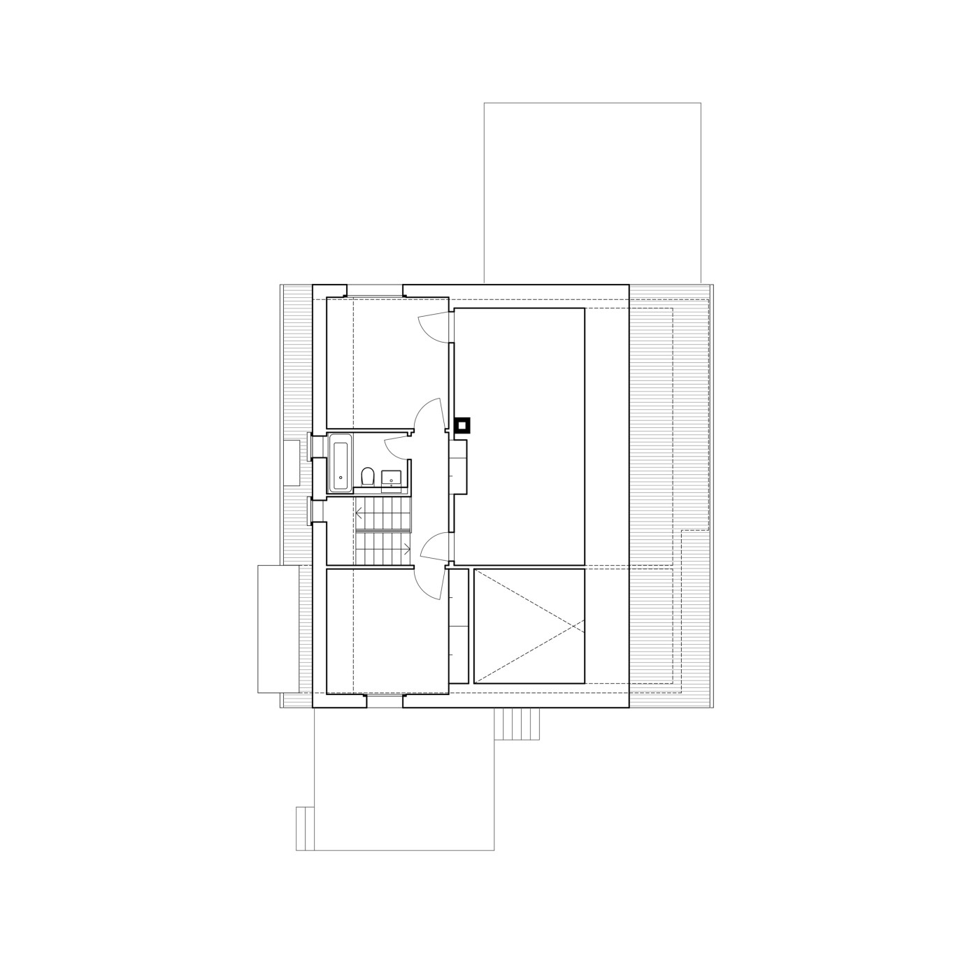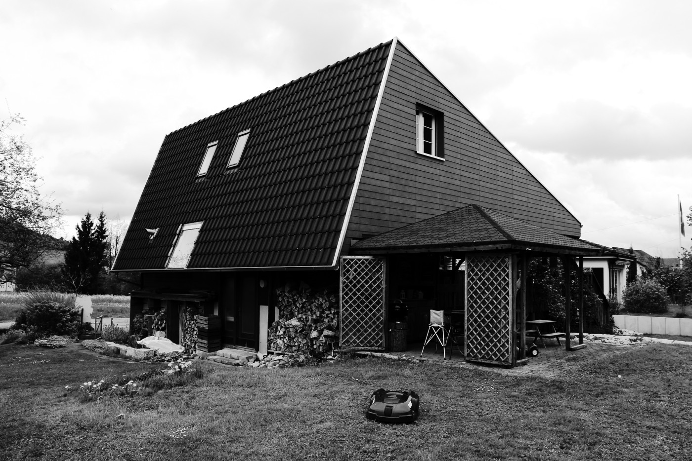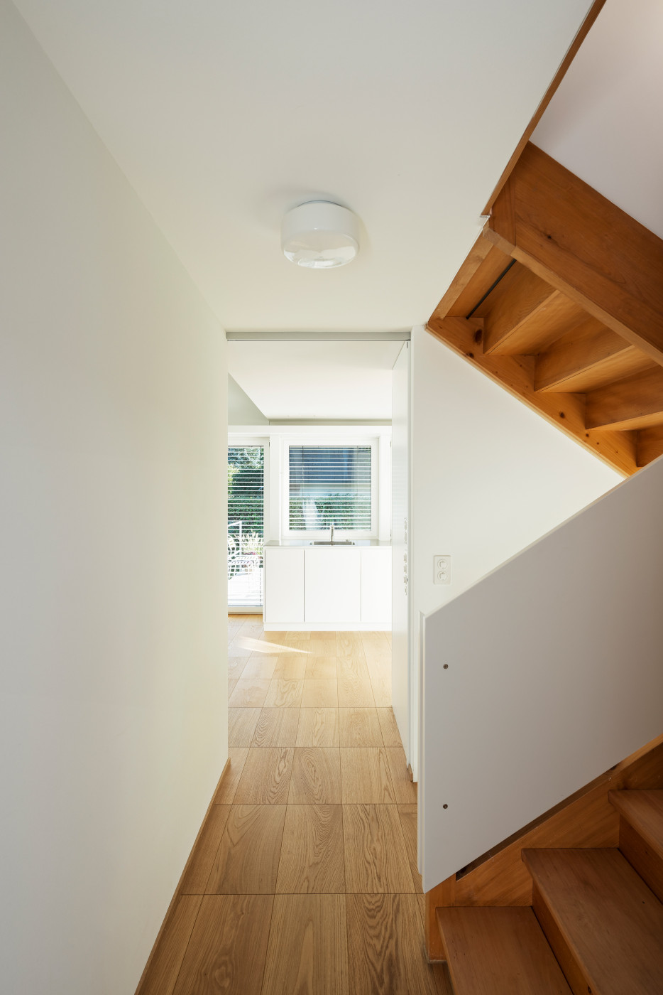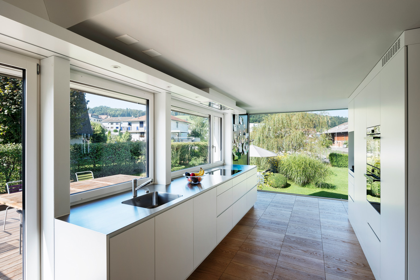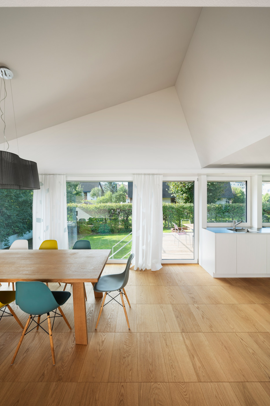 Anstelle dunklen Täfers sind die Räume neu verputzt, Wände und Einbauten weiss, die Decken leicht grau gestrichen und im überhohen Esszimmer, dem wichtigsten Raum, die Dachform spürbar. Die Fensterfront im Süden und grosszügige Festverglasungen in Küche und Wohnraum schaffen den bisher schmerzlich vermissten Bezug zum Aussenraum. Die der Küche vorgelagerte Veranda dient als Sprungbrett in den Garten.
