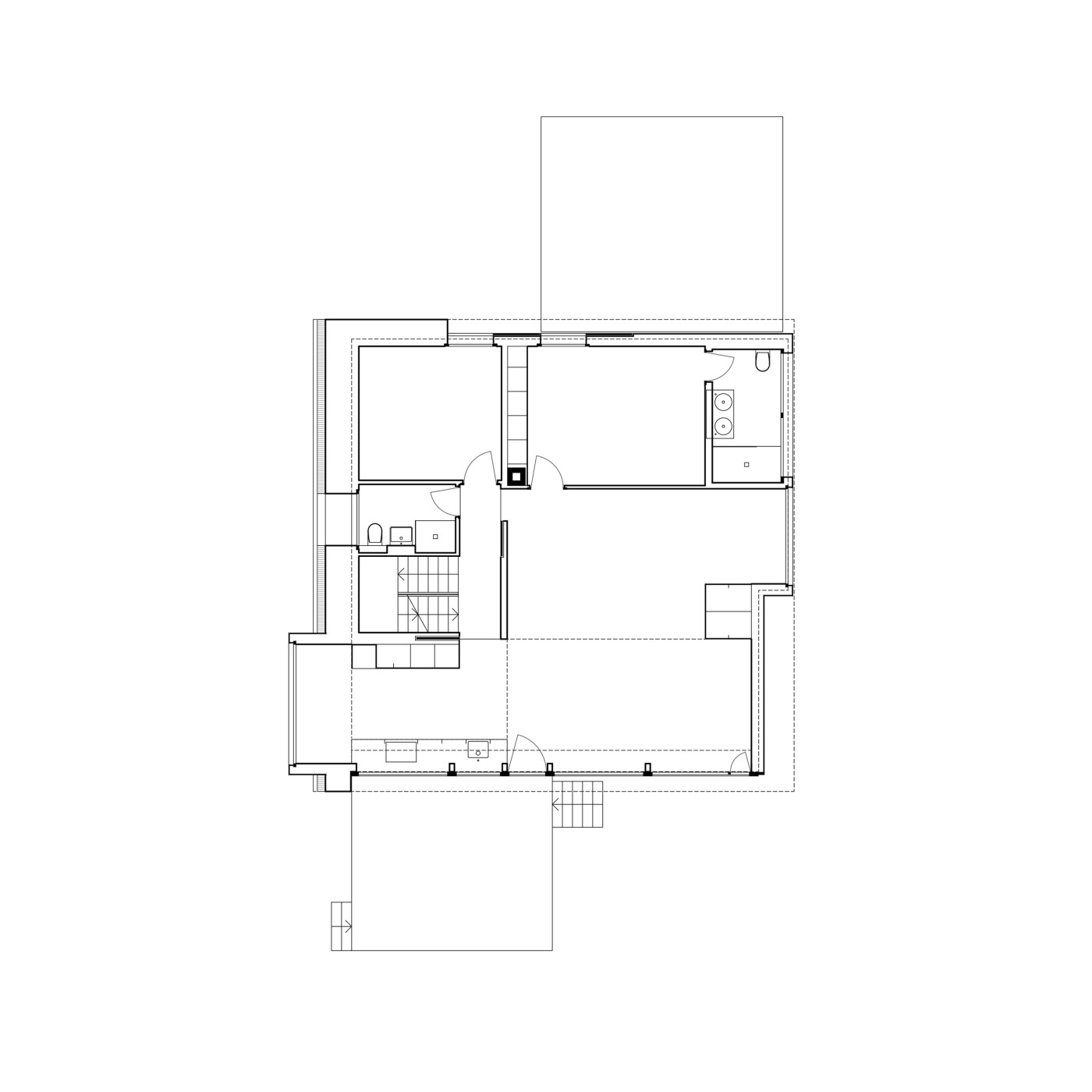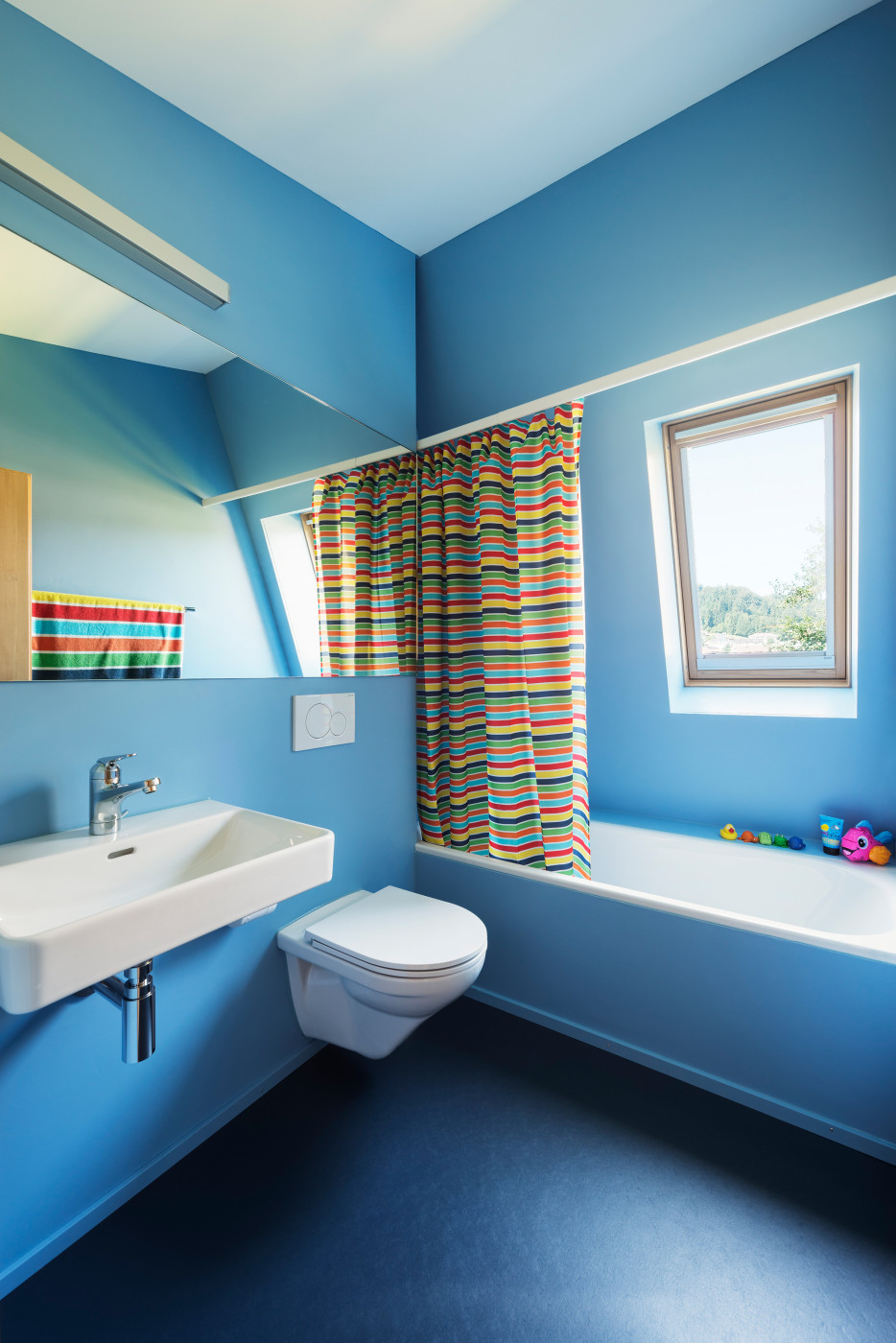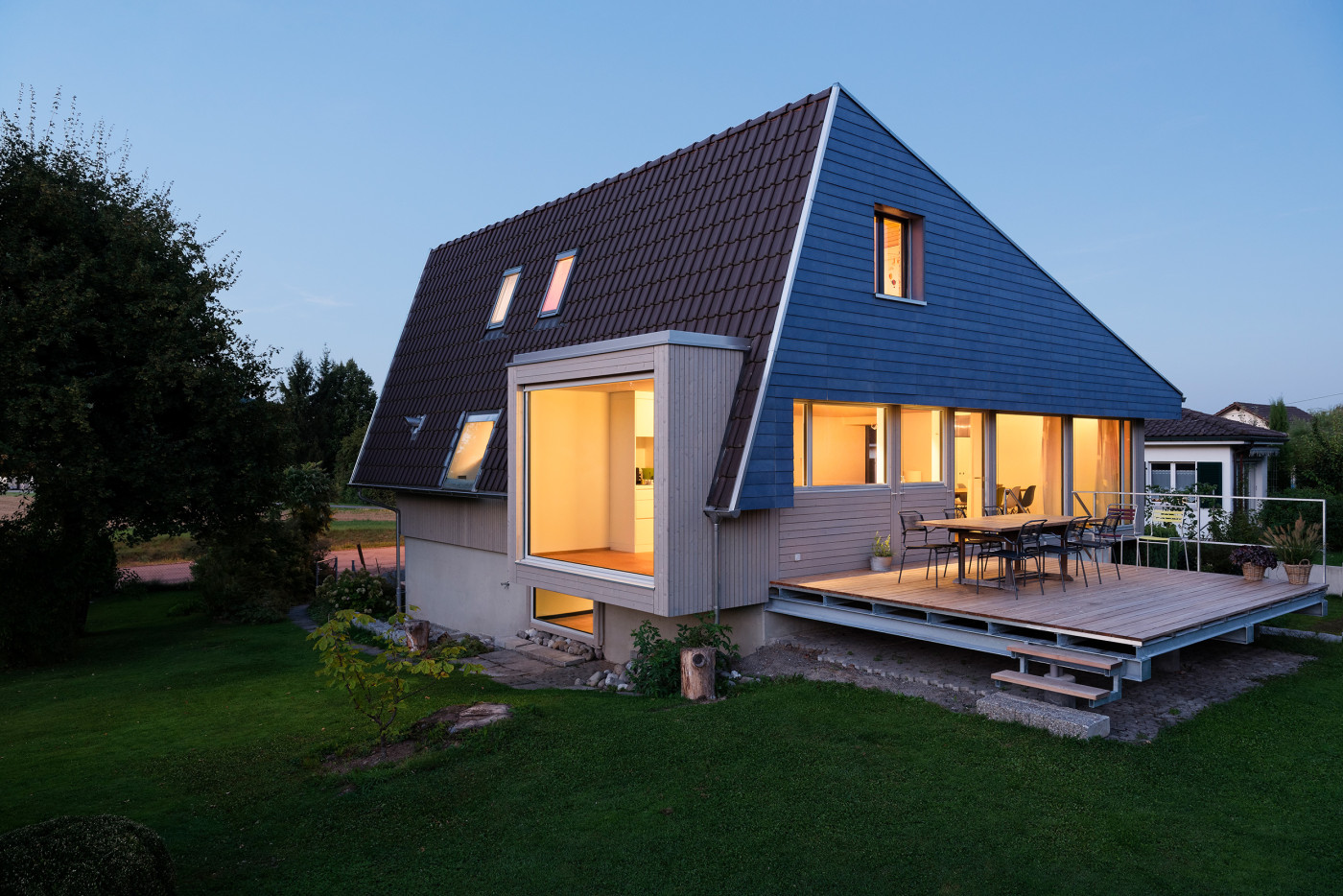 Erdgeschoss ausgetauscht: Die Wohnebene des Einfamilienhauses mit Jahrgang 1971 ist komplett neu organisiert. Neue Öffnungen und eine Rochade im Erdgeschoss ermöglichen es, die Wohnräume neu nach Süden zu orientieren. Küche und Esszimmer rücken dabei an die Fassade, die Couch bleibt im Zentrum. Gebäudehülle sowie Sockel- und Dachgeschoss bleiben, bis auf das ganz in Blau gehaltene Bad der Jungmannschaft, aus Kostengründen unverändert.