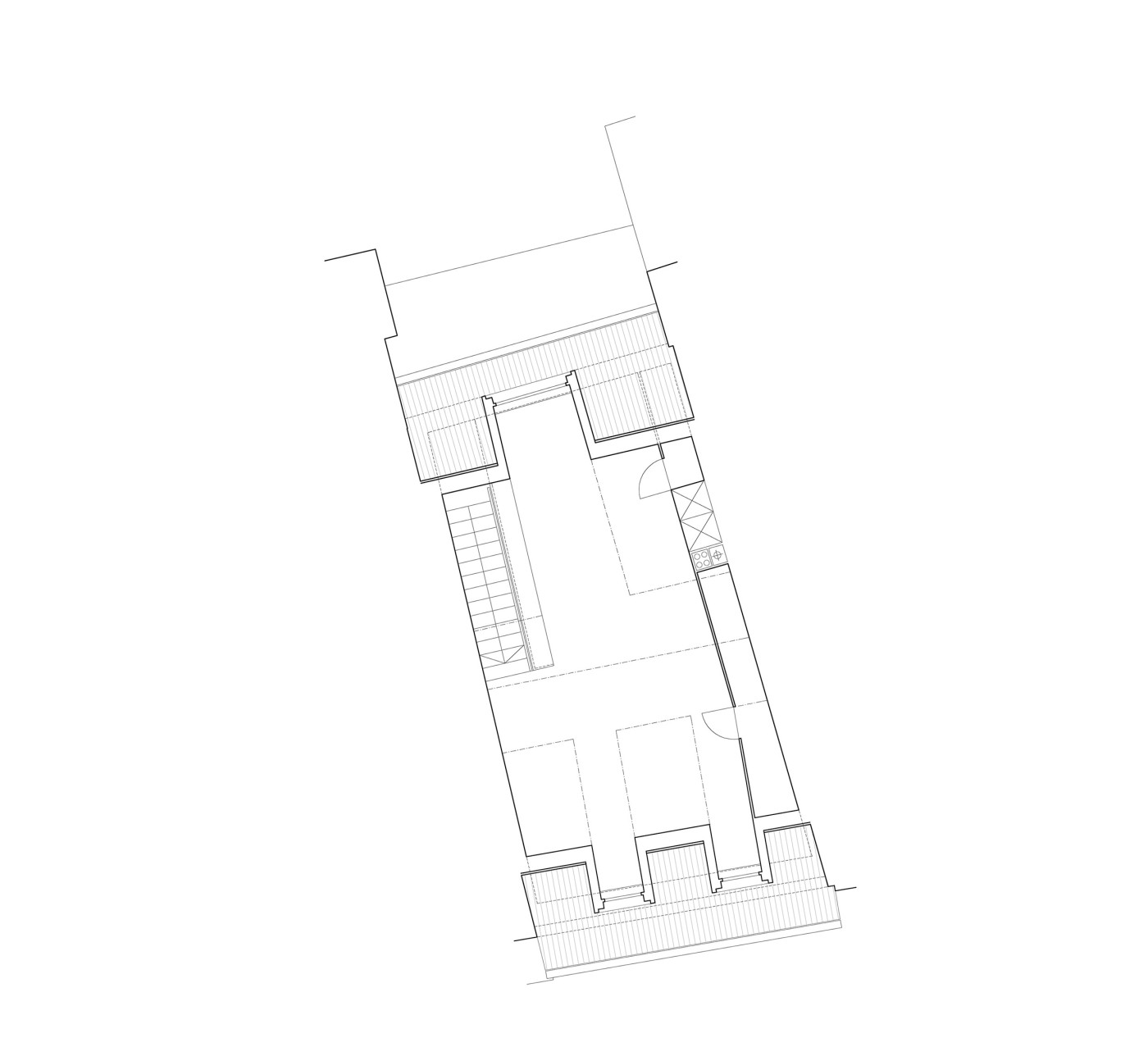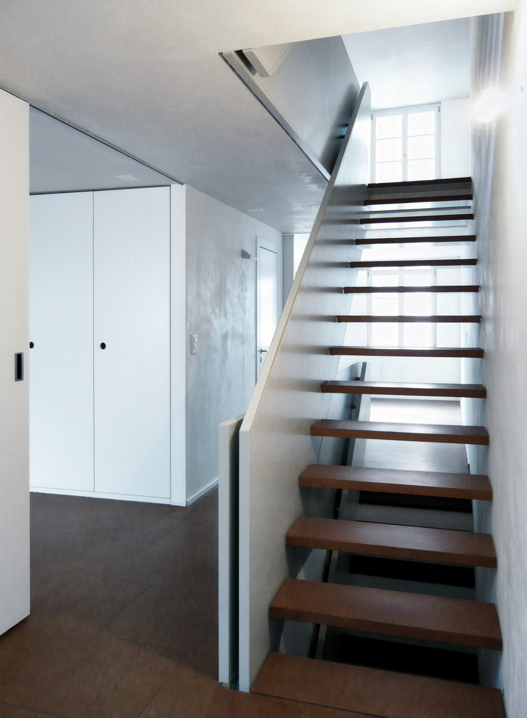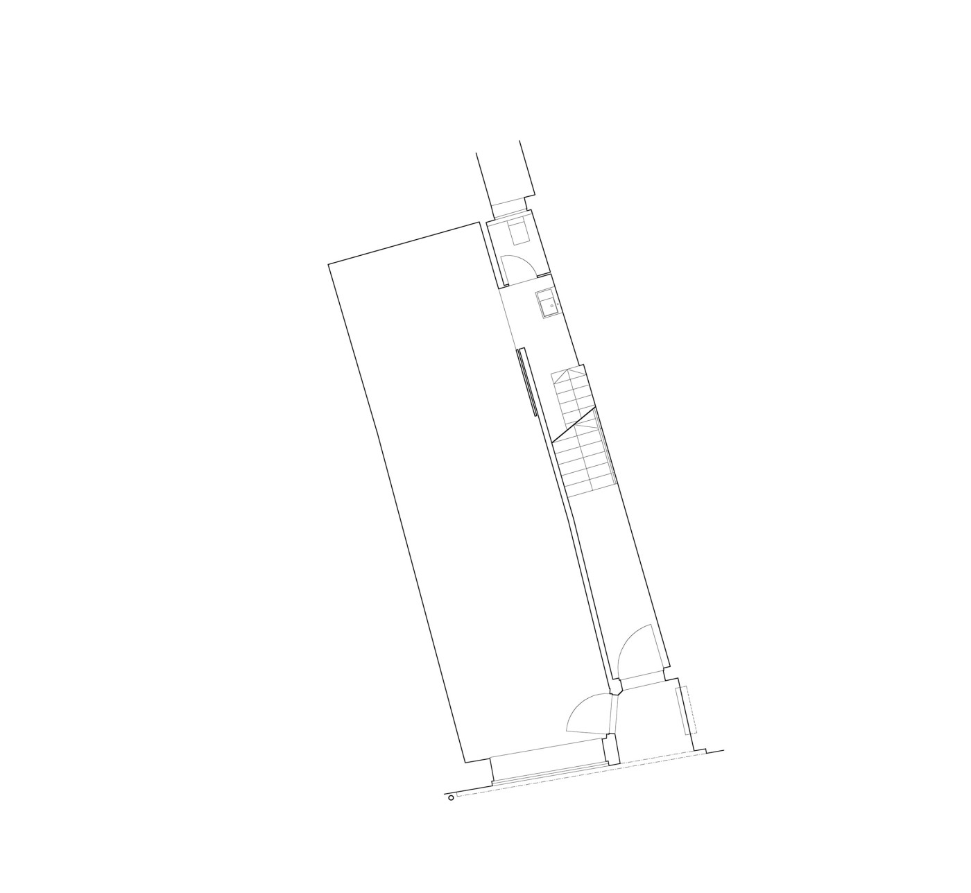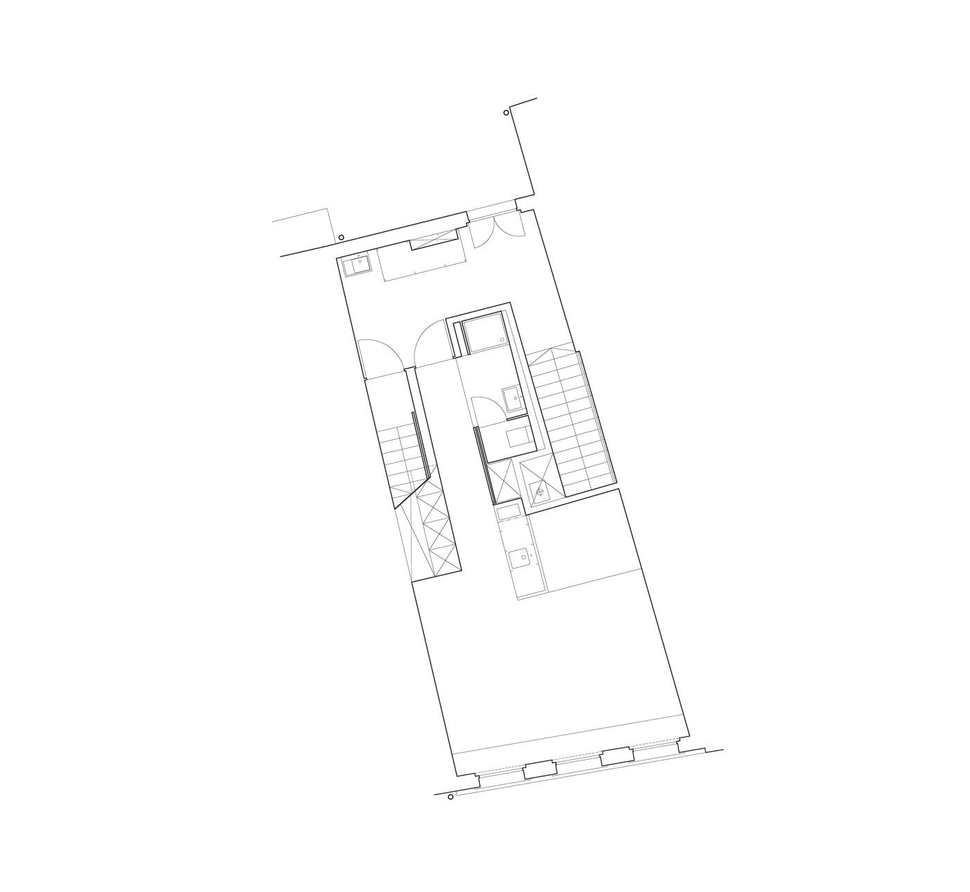 Erd- und Untergeschoss wurden, mit Ausnahme eines schmalen Treppenaufgangs, dem Ladenlokal zugeschlagen. Im ersten Obergeschoss liegen die Zugänge zu den beiden Wohnungen, einem Studio und einer 5-Zimmer-Wohnung. Die lang gezogenen Obergeschosse werden durch das zentral angeordnete Badezimmer in zwei Räume gegliedert.
