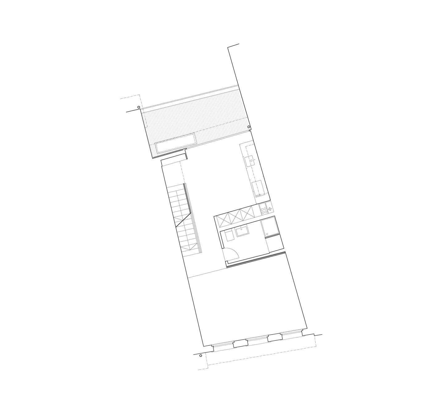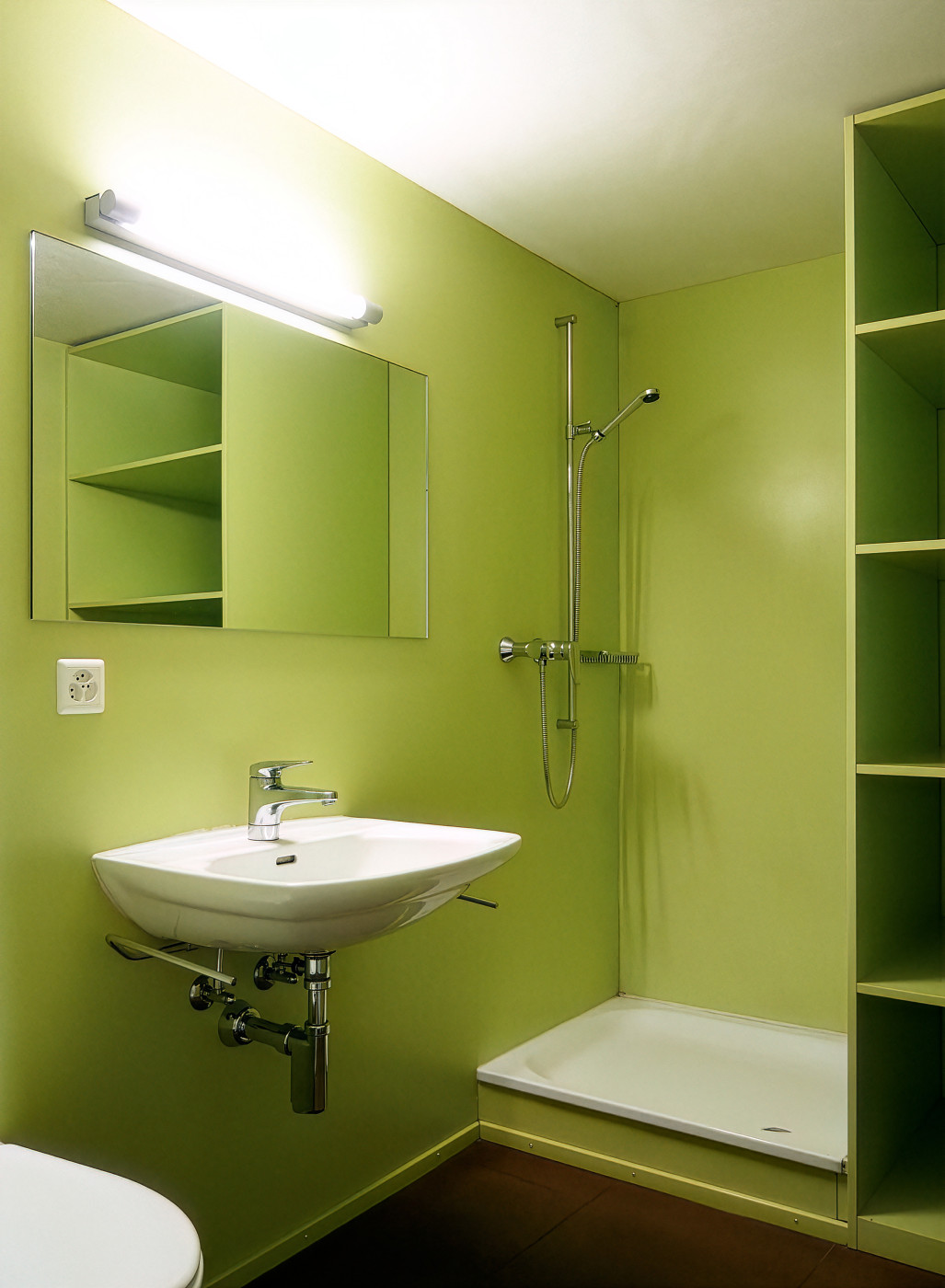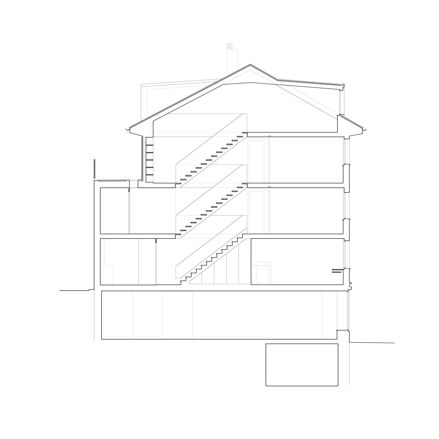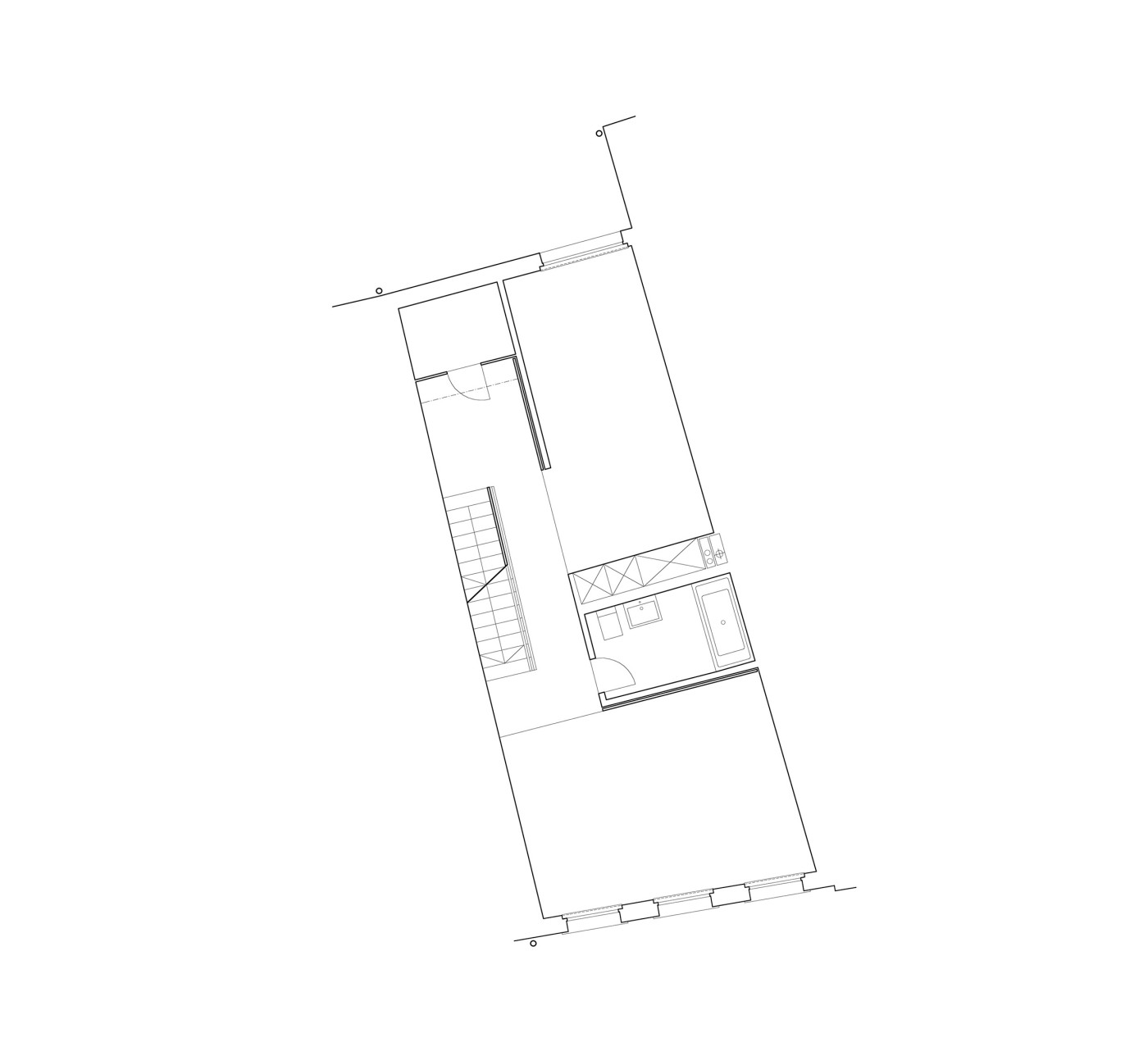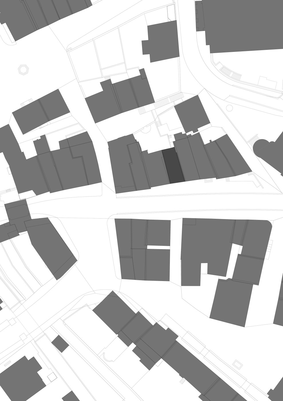 Erd- und Untergeschoss wurden, mit Ausnahme eines schmalen Treppenaufgangs, dem Ladenlokal zugeschlagen. Im ersten Obergeschoss liegen die Zugänge zu den beiden Wohnungen, einem Studio und einer 5-Zimmer-Wohnung. Die lang gezogenen Obergeschosse werden durch das zentral angeordnete Badezimmer in zwei Räume gegliedert.