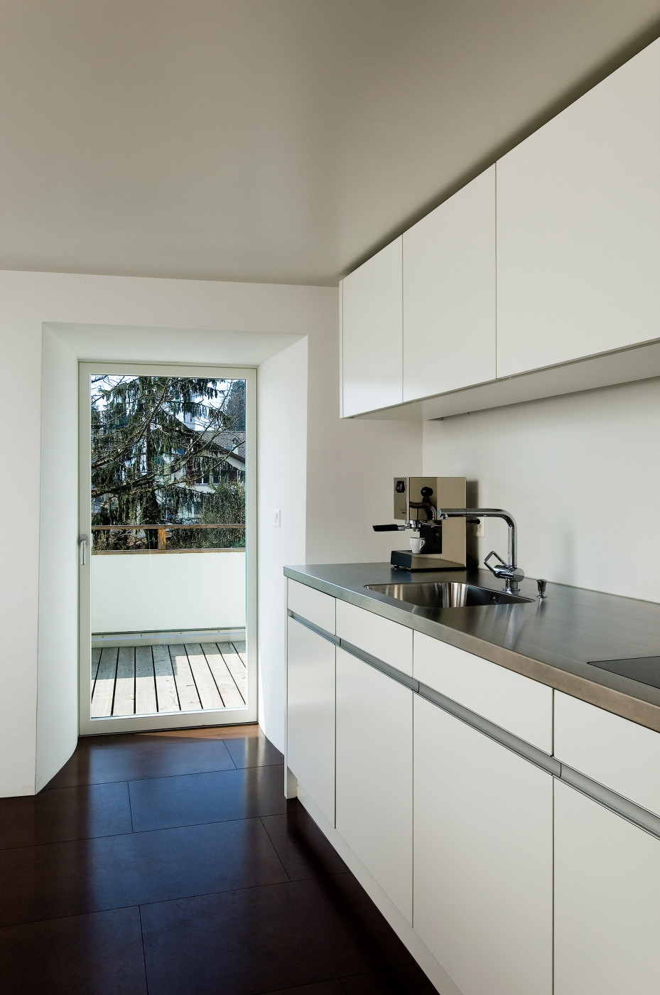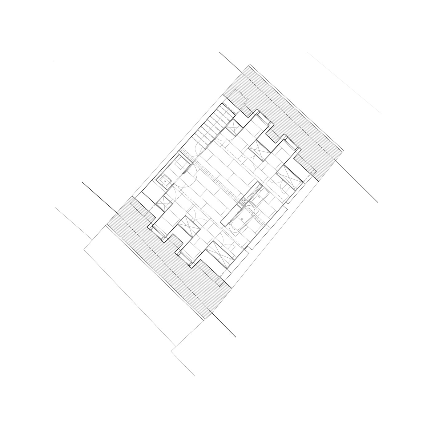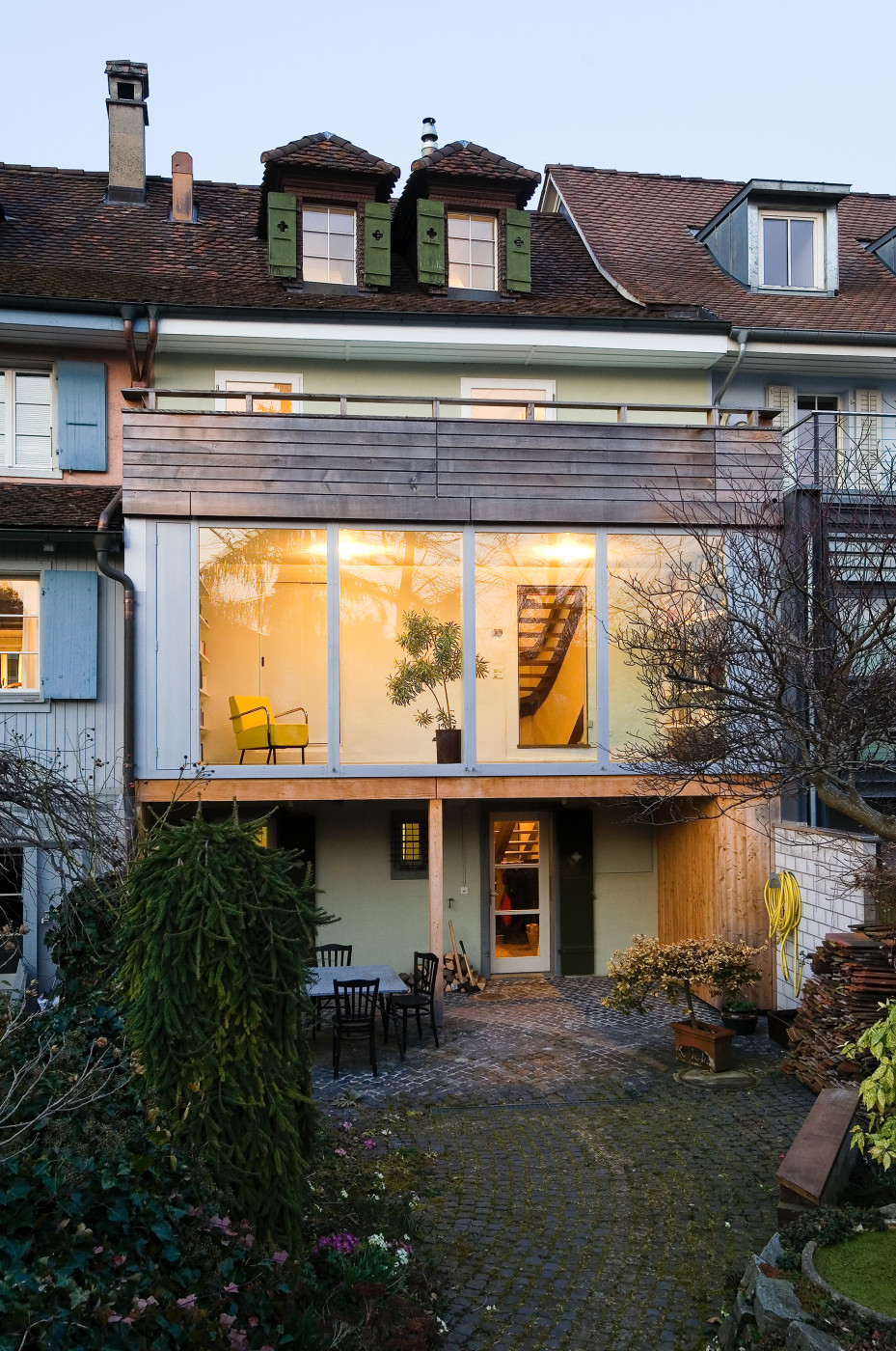 Die ursprünglich kleinteilige Zellstruktur des zweiten Obergeschosses wird zugunsten einer offenen, zur Terrasse hin orientierten Wohnküche aufgehoben. Die an die Brandmauern gerückten Treppen und Einbauten ermöglichen einen grosszügigen Raumeindruck auf bescheidener Grundfläche. Das Dachgeschoss, vormals Wohnraum, wird neu als Elternschlafzimmer mit offenem Bad genutzt.