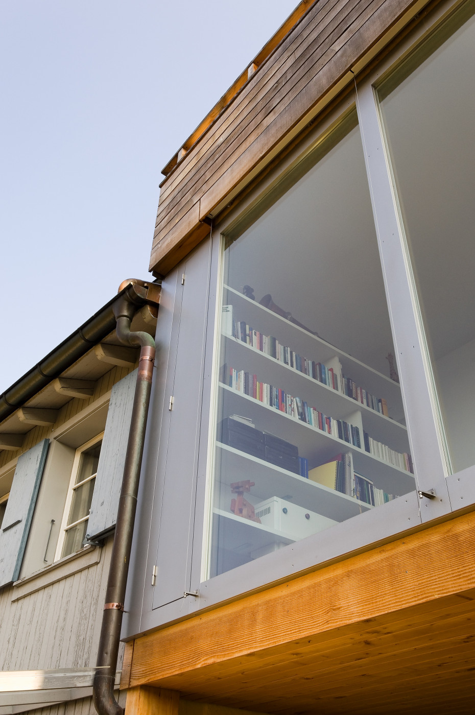 Anstelle des ehemaligen Wintergartens im Erdgeschoss schafft der Ersatzneubau der Laube neu für sämtliche Geschosse den gewünschten räumlichen Bezug zum Garten: Die filigrane Holzständerkonstruktion dient als gedeckter Sitzplatz auf Gartenniveau, erlaubt im Lesezimmer des ersten Obergeschosses den maximalen Ausblick auf das umliegende Grün, und die neue Terrasse wird zum Sonnendeck des komplett umstrukturierten Wohngeschosses.